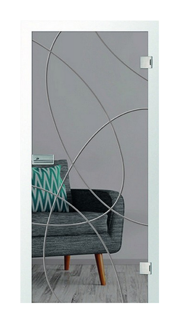 Die vollflächig mattierte Glastür mit Rillenschliff ist ein besonderes Design-Element. Die in das Glas geschliffenen V-Rillen ziehen sich in geschwungenen Linien über das Türblatt und teilen es in abstrakte Flächen ein.