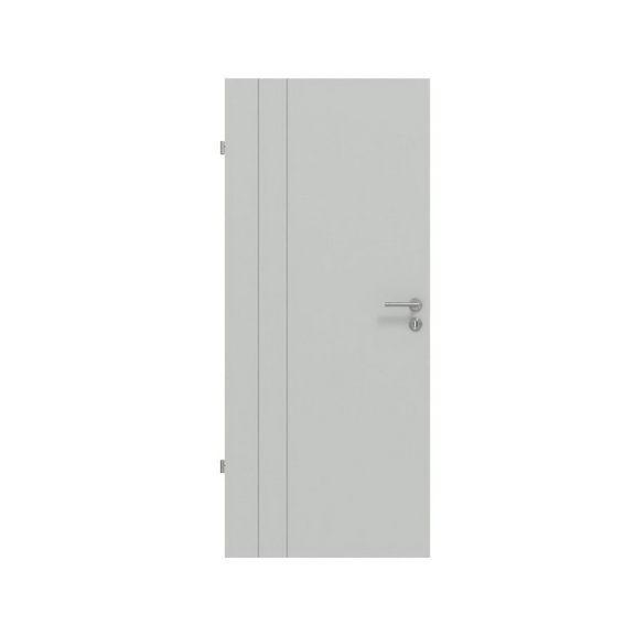 Senkrecht über das Türblatt verlaufen zwei eingefräste Fugen. Diese sorgen für eine besonders exklusive Optik, die durch die Graulackierung noch verstärkt wird.