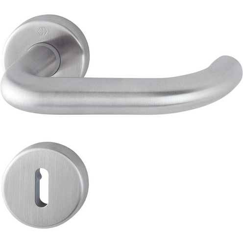 Das Modell bietet ein schlichtes Design und hohe Funktionalität in einem. Durch den Verzicht auf jedes dekorative Detail wird die moderne, klassische Optik der Garnitur nochmals betont. Die klammerartige Form der Klinke und das Richtung Tür weisende Ende sorgen für einen sicheren Griff. Zusätzlich verleiht die mattierte Edelstahlbeschichtung dem Set eine robuste Oberfläche.